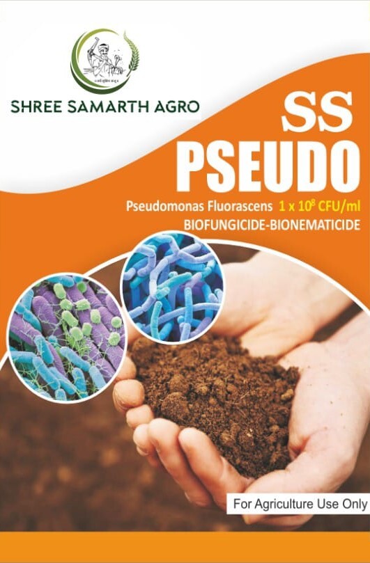 SS Pseudo by Shree Samarth Agro, a biofungicide and bionematicide formulated with Pseudomonas fluorescens (1 × 10⁸ CFU/ml). The packaging features a vibrant orange and white design, along with visuals of beneficial microbes and healthy soil held in hands, symbolizing soil protection and crop health. Clearly labeled “For Agriculture Use Only,” this product is designed to enhance plant immunity, protect against soil-borne diseases, and promote strong root development.